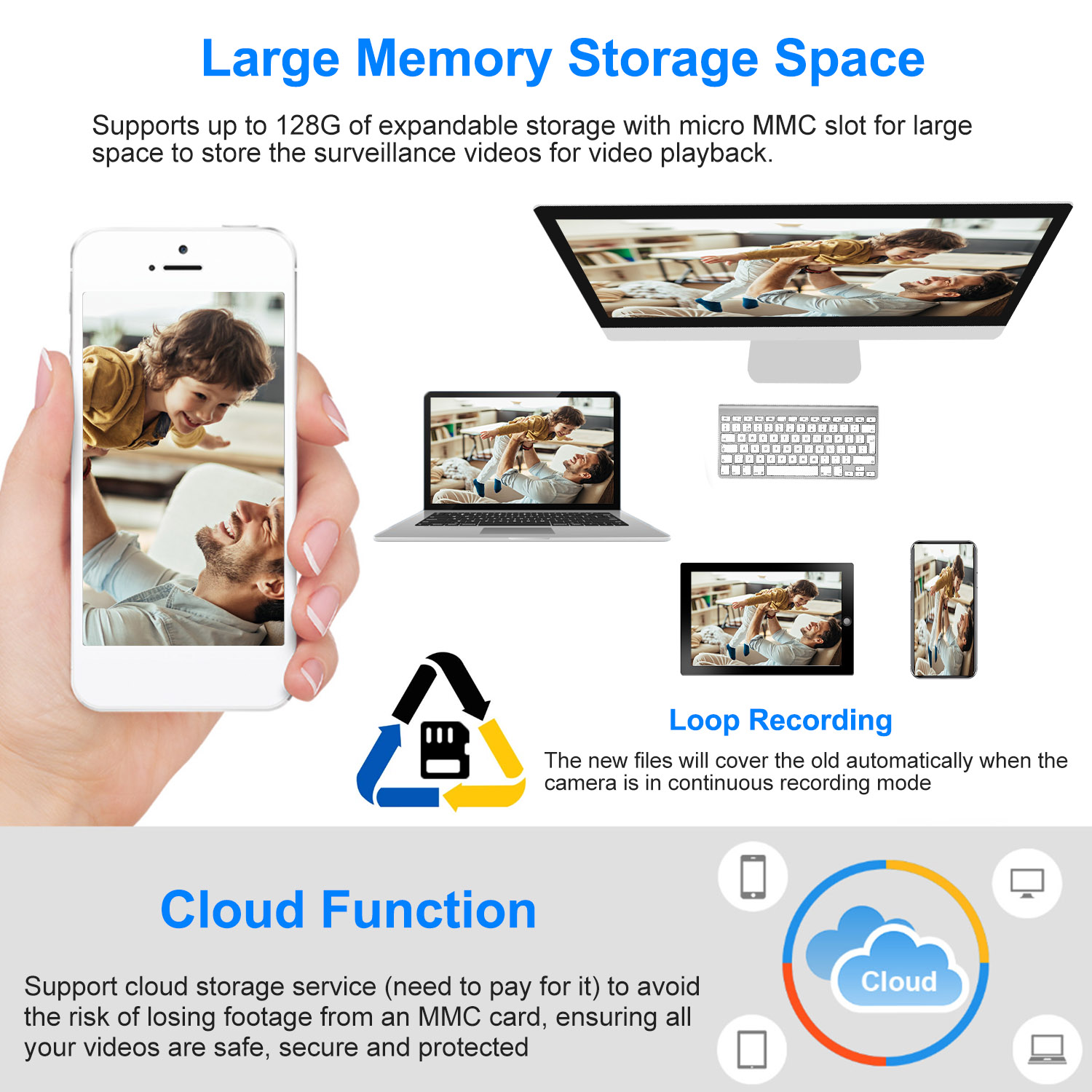 iMounTEK 720P WiFi IP Camera -Your 360° Complete Coverage Smart Home System. The 720P WiFi IP Camera is a good help for you to keep an eye on your home or office for home & office security from any place in the world. It features 360° full coverage, motion detection, IR night version and two-way intercom function. And, it can be easily installed on the tabletop, ceiling or wall, etc. with a mount base plate and 2 pairs of screws included. After installing and WiFi connecting via your existing home WiFi network, easily check and control the IP Camera from your smartphone or tablet PC via YI IoT App (2.4GWiFi/3G/4G Network), no hub is required. Moreover, it supports up to 128G of expandable storage with MMC slot for large space to store the surveillance video for video playback on mobile App and PC software and cloud storage service to avoid the risk of losing footage from a MMC card, ensure all your videos are