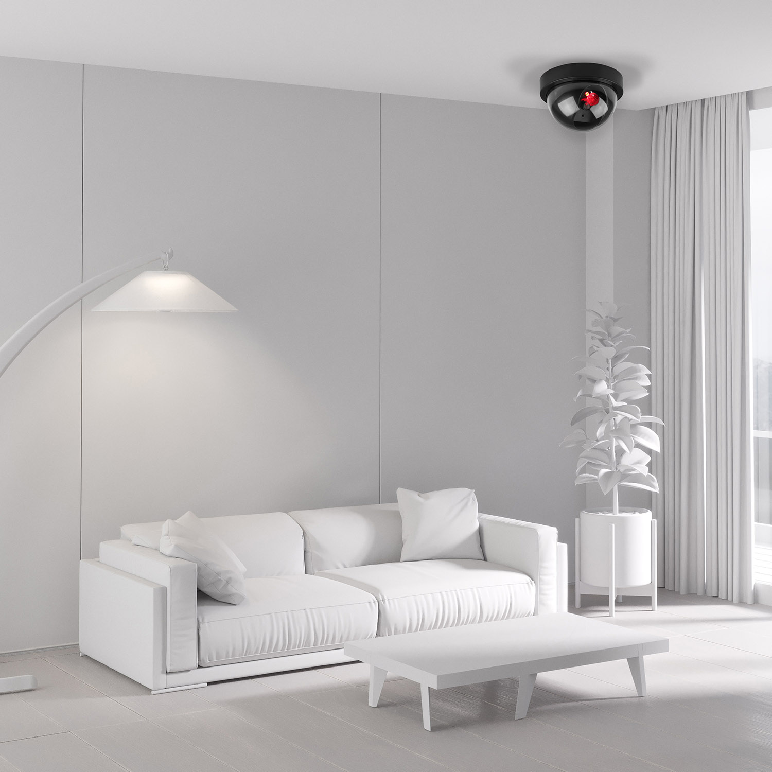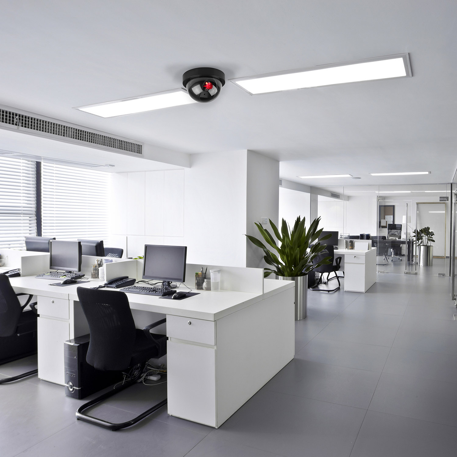 Install these dummy cameras to help deter thefts, intruders, secure premises and prevent against vandalism at home, in office, shop, supermarket, hotel, parking lot, library, school or anywhere else desired in a simple and cost efficient way, especially when using along with real cameras. Simply put into 2 AA batteries and mount to celling or wall with included screws.