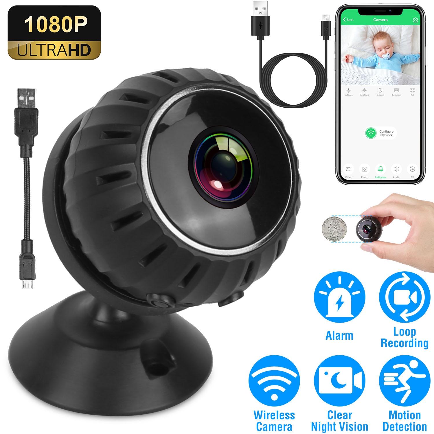 Mini Wireless Camera Wifi IR Night Vision HD 1080p Home Security Camera for Home Indoor Office Baby Pet