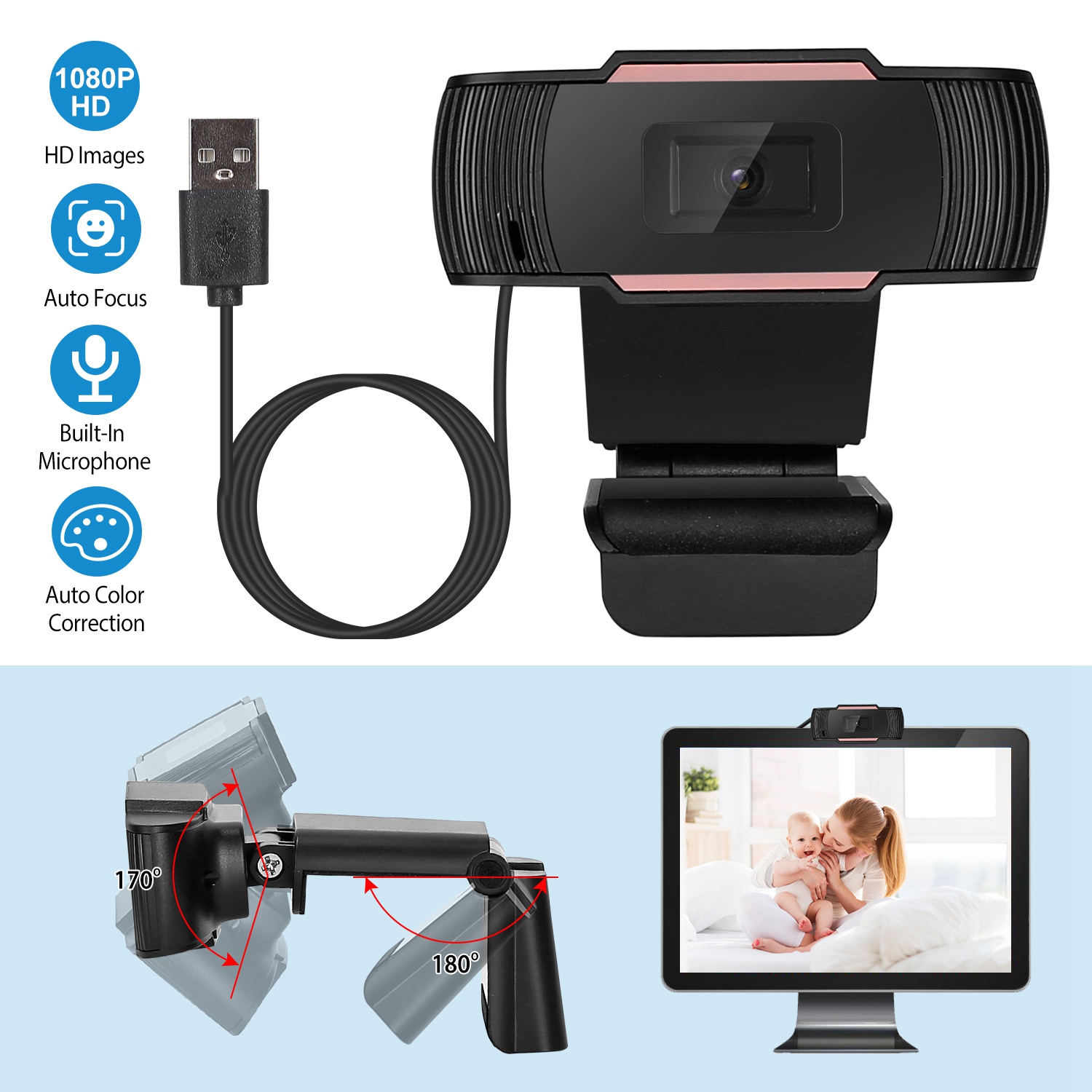 Designed for both laptop and desktop, our USB Webcam can be stably placed and clamped on the display, supporting various video meeting and works. No need to adjust the lens for it can focus automatically. With built-in microphone, you can hear the voice clearly in 10m/32.8ft.