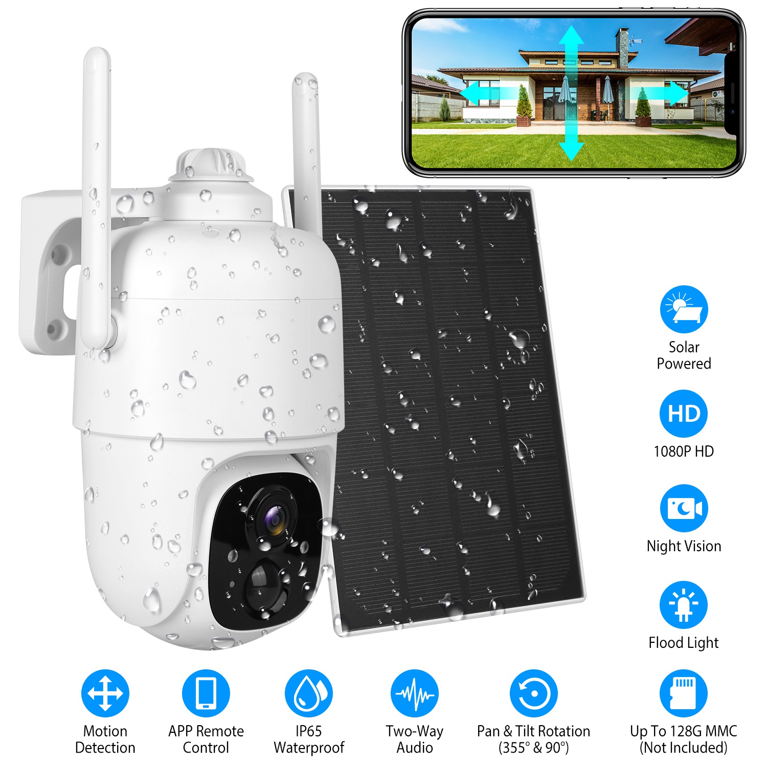 Our 1080P WiFi IP Camera is a good helper to keep an eye on your home or office! It features with full coverage, motion detection, IR night version, flood light and two-way intercom function. Can be easily placed on the table top or mounted on ceiling or wall. After installing and WiFi connecting, easily check and control the IP Camera via the App on your phone. 9000mAh Lithium battery, solar panel and Wi-Fi antennas ensure eternal power and 100% wireless free. IP65 waterproof allows it to withstand heavy weather when installed outside. Moreover, it supports up to 128G large space and extra MMC card slot to store the surveillance video for video playback and cloud storage service to avoid the risk of losing footage from an MMC card. Bring you much convenience with this solar wireless security camera.