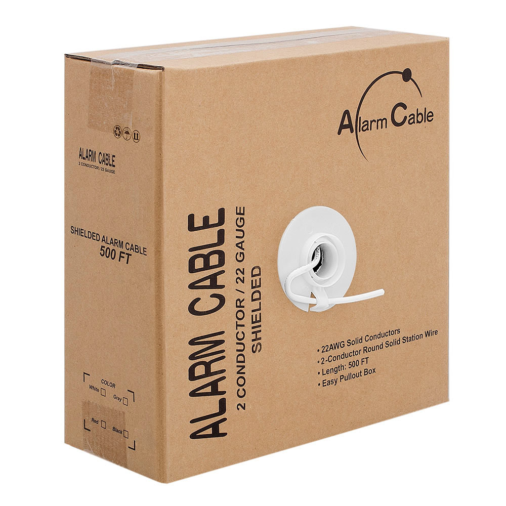 This product features a 500ft 22AWG 2 conductor round Security Alarm CCA cable with aluminum foil shielding. This cable is suitable for alarm security systems and other low voltage electrical hookup applications. You can use it to connect door and window sensors, motion detectors, keypads and other hardwired accessories to your alarm panels. The aluminum foil shielding provides protection from power frequency and radio frequency interference, reducing the number of false alarms being generated. The cable comes in a pull out box making it easy to use.