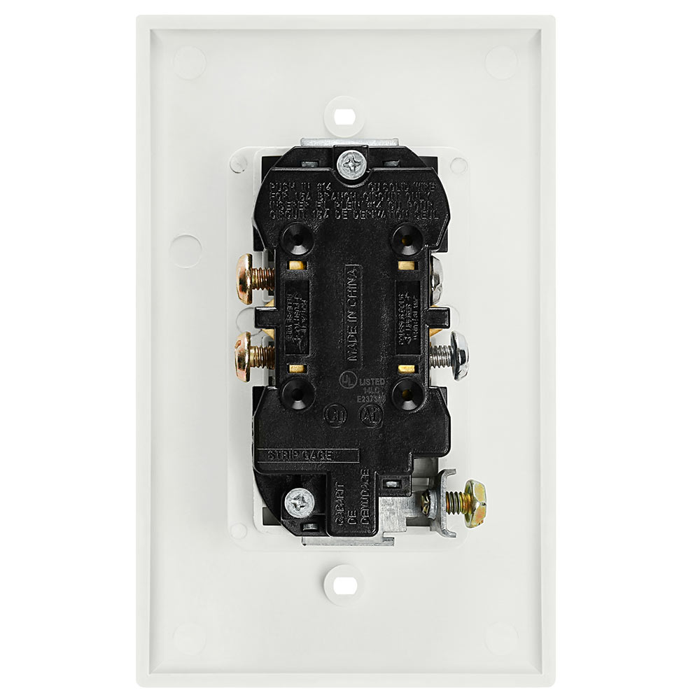 Wall Plate- 1 Gang Recessed Dual Power Outlet, UL Listed This product has a minimalist design that is sleek and unnoticeable. Perfect for remodeling or new construction projects, this power outlet creates 1 inch of extra room to connect to your devices. It comes with a built-in wall plate and works great behind flat screen displays. Features: 125V 15Amp Self-grounding UL-Listed Color: White Dimensions: 4.5/8in x 2.7/8in x 2in, 1in recessed area