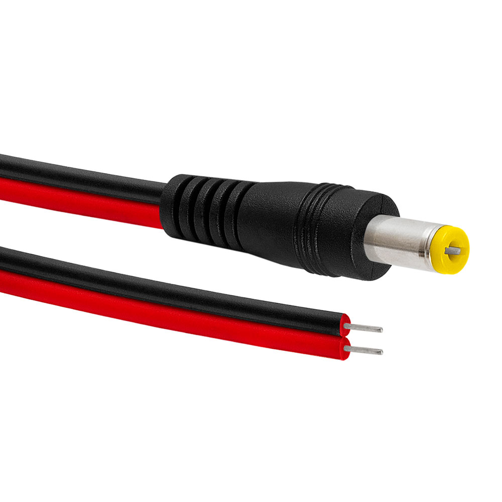 Male Plug 12V DC Power Pigtail Cable Jack for CCTV Security Cameras DC power pigtail is used to connect your security cameras to your power distribution system or power adapter. It features a male coaxial power plug on one end to two bare wires on the other. 8 inch connector for CCTV camera power. Male DC Cable Copper Conductor Material Color: Red and Black 12V DC Power Leads Length: 8in