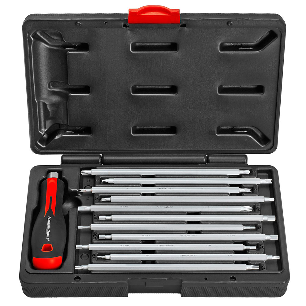 The perfect set for security installers - reach into those deep crevices with ease and never be without the right screwdriver. It features a non-slip, comfort grip handle with a high impact plastic core and 11 double sided security shaft style bits. The shaft style enables access into recessed screws up to 5 inches deep. The bit load includes multiple sizes of security Torx® hex and Robertson along with spanners and tri-wings so the list of applications is endless. This kit can be used on standard hex and torx screws and includes a slotted and Phillips head bit for traditional screwdriver applications.