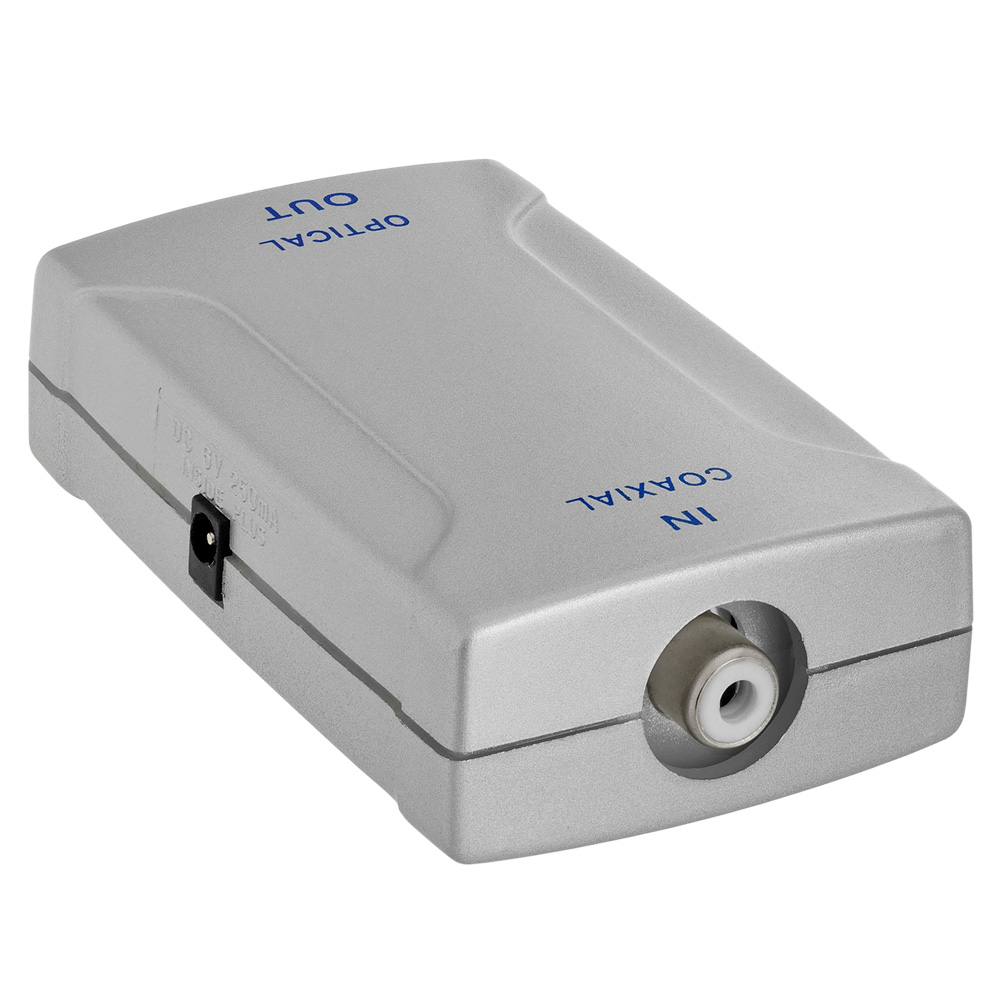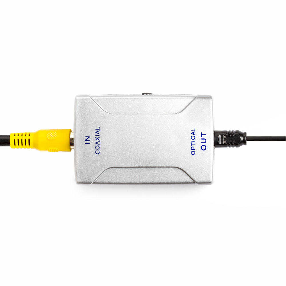 It consists of one Coaxial RCA jack that serves as the input and one Optical Toslink jack that serves as the output. This adapter is used to transform your Digital RCA Coaxial (S/PDIF) audio signal to a Digital Toslink Optical signal. Using a Coaxial RCA plug (IN) to an Optical TosLink plug (OUT).