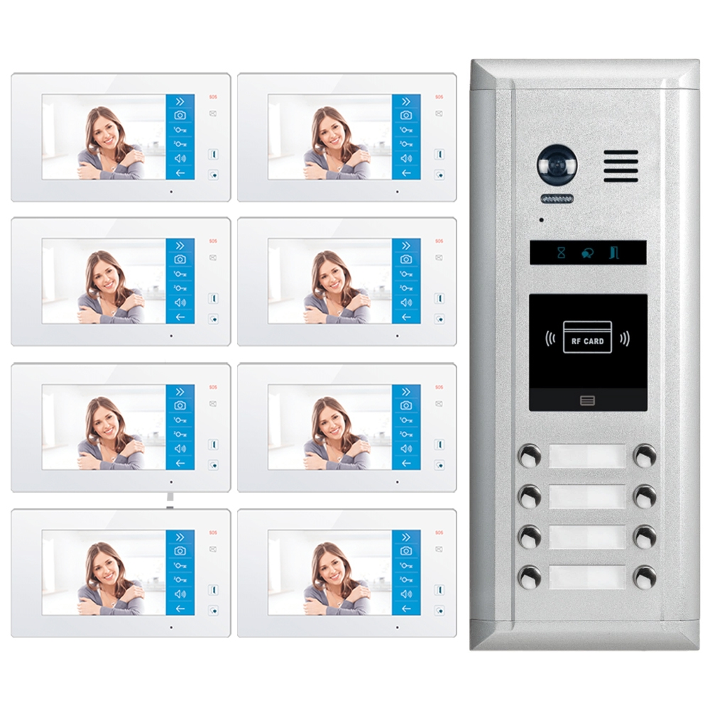Eight Apartment Wi-Fi Video Intercom System with Eight 7" Touch Screen MonitorsThis 2-Wire front door video intercom entry system can boost safety within your home by creating a barrier between you and whoever is outside. The front door intercom system offers convenience, as well as an added layer of security. After all, it may be the case that not every visitor is a welcome one.