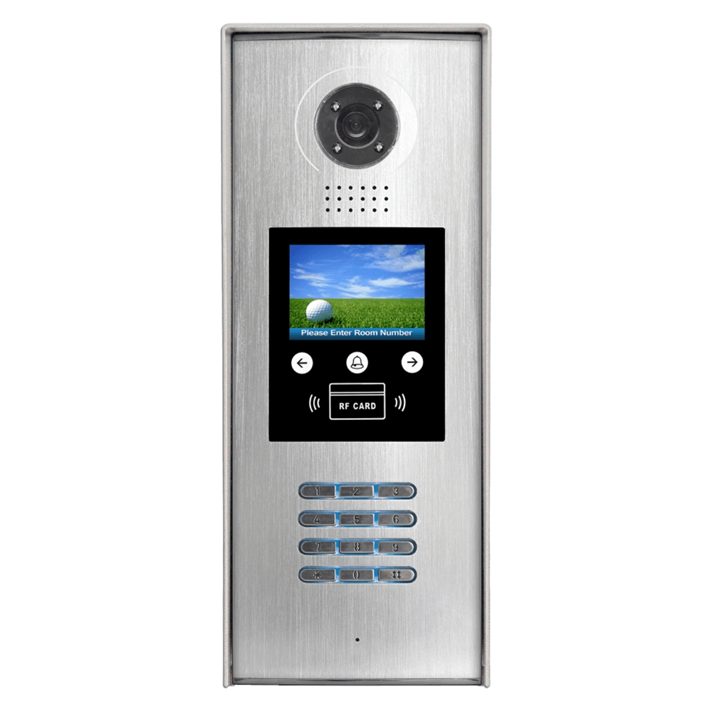 This door station has a built-in proximity reader and keypad so that residents can open the door lock either with an RFID fob/card or password via keypad from the outside. It has 3.5 inch TFT screen with scrolling information for first-time visitors telling them how to contact an apartment. The doorbell voice function tells visitors if the door is open, or a resident is unavailable- very useful for visually impaired people. This door station is digital meaning the number of apartments can be increased or decreased if necessary. Scrolling info on the screen can be amended via an SD card. The front door intercom system offers convenience, as well as an added layer of security.